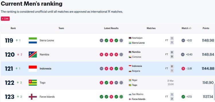 Tepat di bawah Indonesia, Togo yang berada di peringkat 122, saat ini mengantongi 1141.90 poin. Namun, Togo yang akan menghadapi Niger pada Selasa (31/3/2026), berpeluang menambah poin dan menggeser posisi Indonesia.