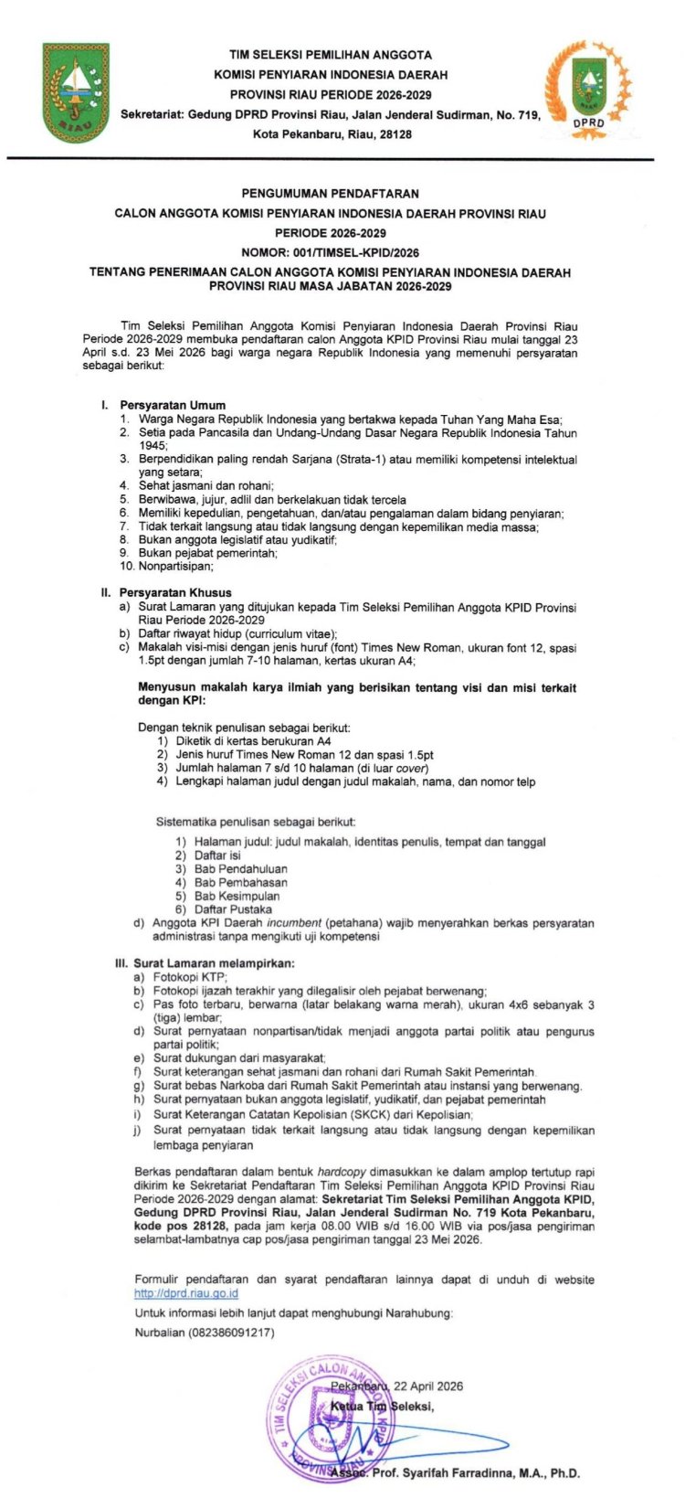 Tim Seleksi Pemilihan Anggota Komisi Penyiaran Indonesia Daerah (KPID) Provinsi Riau Periode 2026-2029 membuka pendaftaran calon Anggota KPID Provinsi Riau mulai 23 April 2026 - 23 Mei 2026 bagi warga negara Republik Indonesia yang memenuhi persyaratan.