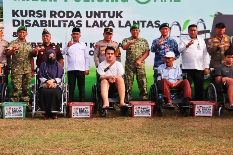 Pada rangkaian kegiatan tersebut, Polda Riau juga menyerahkan bantuan kursi roda kepada korban kecelakaan lalu lintas, serta membagikan helm kepada pengendara ojek online dan para pelajar SMA sebagai bentuk edukasi keselamatan.