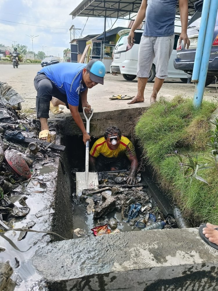 Genangan air di depan Masjid Darul Iman diketahui terjadi akibat tersumbatnya saluran drainase oleh tumpukan sampah, terutama sampah plastik.
